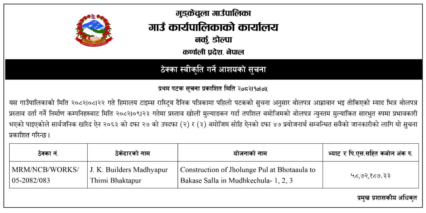 ठेक्का स्वीकृति गर्ने आशयको सूचना !!!